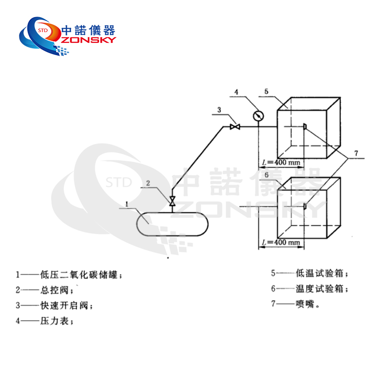 3.1儀器組成:由空氣源或液態(tài)二氧化碳瓶、試驗裝置、高溫試驗箱、低溫試驗箱組成;